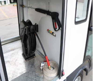 2.前有兩個(gè)可旋轉(zhuǎn)、高度可調(diào)的高壓噴頭,下方有一排噴淋頭,駕駛室內(nèi)操作,可自動(dòng)實(shí)現(xiàn)對(duì)路面及路牙聚積的污泥清除、狹窄道路灑水等;
