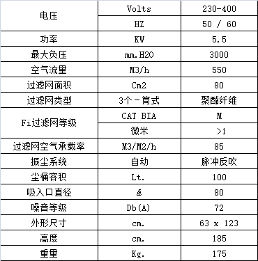 3個聚酯纖維筒式過濾網裝在鋼制過濾艙中,總過濾面積80000 cm2,過濾精度 高達1微米 。全自動空氣脈沖反吹清潔系統通過壓縮空氣輪流吹向筒式濾網,清潔頻率可通過控制面板上的定時器進行設置,能持續有效地清潔過濾網,清除附著在濾網上的大部分灰塵,從而保持機器正常的吸塵功效和延長濾網使用壽命。模壓鋁制吸塵口直徑為Ø80 mm,位于過濾網下面,能夠同時吸塵、吸固體和吸水(水量不得超過塵桶容量),無需更換或取出過濾網。 壓縮機需另配。